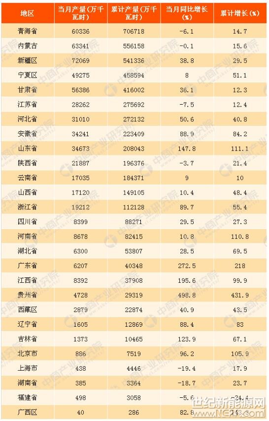 在2017年1-10月中国各地区太阳能发电量排行榜中,青海省排名第一,10月当月产量为60336万千瓦时,1-10月累计产量为706718万千瓦时,同比增长14.7%;内蒙古排名第二,10月产量为63341万千瓦时,累计产量为556158万千瓦时,同比增长15.6%;新疆排名第三,10月产量为72069万千瓦时,1-10月累计太阳能发电量为541336万千瓦时,同比增长29.5%。