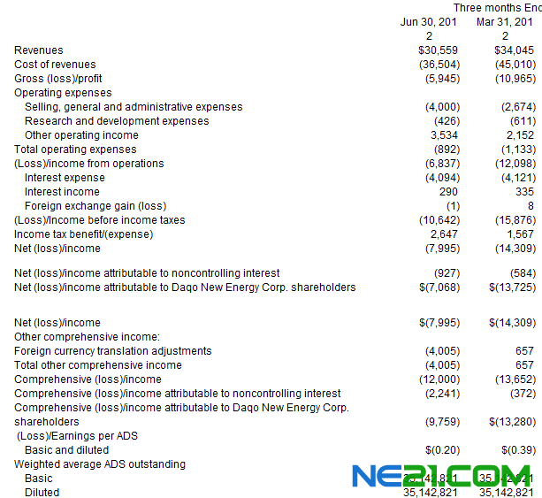 来源:i美股发布时间:2018-02-02 14:22:17 索比光伏网讯:)北京时间8月17日消息,大全新能源盘前公布其截至2012年6月30日的二季度财报,财报显示: