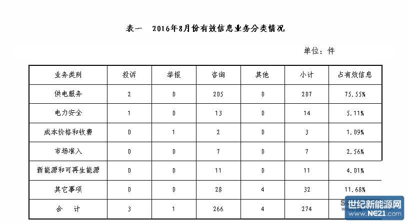 从业务分类情况分析:供电服务207件,占有效信息的75.55%;电力安全14件,占有效信息的5.11%;成本价格和收费3件,占有效信息的1.09%;市场准入7件,占有效信息的2.56%;新能源和可再生能源11件,占有效信息4.01%;其它事项32件,占有效信息11.68%。(2016年8月份有效信息业务分类情况见表一)