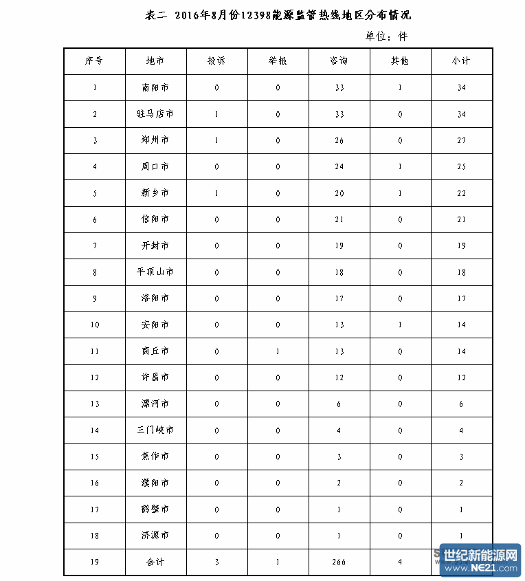从有效信息数量来看,南阳、驻马店、郑州地区排在全省前三位。(2016年8月份12398能源监管热线地区分布情况见表二)