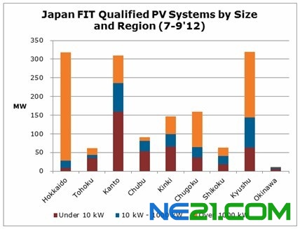 日本政府在今年7月开始实施全国上网电价。仅在7月到9月期间,就有接近1.5 GW的光伏项目申报并得到了补贴资格,占到了日本政府计划在2012年7月到2013年3月期间安装量的60%。在这1.5 GW的光伏项目中,规模大于1 MW的项目比例超过了50%。 具体到各个地区来看,九州岛地区获得补贴资格的项目总容量最多。 北海道地区获批的大型地面项目超过其他区域,主要得益于大量可利用的空地资源。而在人口密度相对较高的关东地区,核准的项目以小型屋顶项目为主。