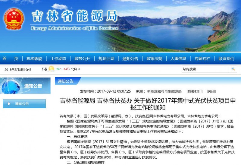 吉林省能源局、吉林省扶贫办下达《2017年光伏扶贫项目计划通知》。