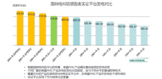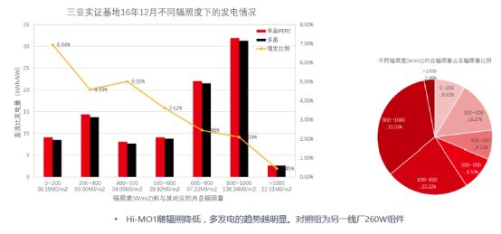 中国电气院国家重点实验室三亚实证基地实验数据显示,对比单晶PERC和两块常规多晶组件,PERC单晶组件的单瓦发电量平均高出4.07%和2.93%。对应的不同的辐照度、尤其是低辐照下,组件的发电量的提升更加明显,200W/m2辐照度以下可以提升6%,在400-500W/m2范围内以上则提升5%,有效印证了PERC单晶在弱光情况下的优异发电性能。