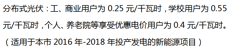 分布式光伏的“度电补贴”金额为:工、商业用户为0.25元/千瓦时、学校用户为0.55元/千瓦时、个人及养老院等享受优惠电价用户为0.4元/千瓦时,期限为5年。该补贴政策适用当地2016年-2018年投产的光伏项目。