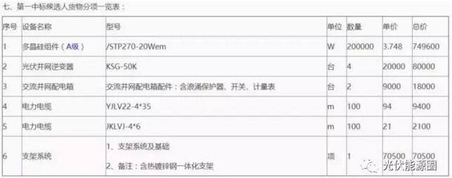 据悉,中标公告中项目所采用的核心部件如组件为70片270的常规多晶组件,而中标价格高达3.748元/W、50K组串逆变器2万/台、并网箱0.9万/台等。
