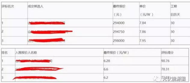 为求证最新的村级电站中标价格,笔者查阅最新的国内各地区中标公告。目前,国内主流的村级电站如30Kw以上300Kw一下的电站,大部分中标价格在6元/W至8元/W之间。如下图山东地区两个项目,第一张中标价格为7.84元/W,第二个为6.28元/W。