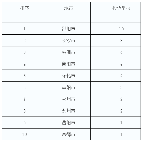按照投诉举报数量排序,邵阳市、长沙市、株洲市、衡阳市、怀化市和益阳市列辖区内前6位。(2018年1月投诉举报排名情况见表二)
