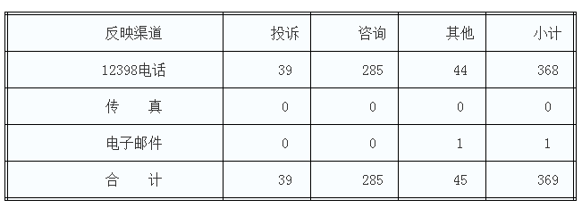 按反映渠道分类,12398电话368件,电子邮件1件。(2018年1月收到有效信息情况见表一)