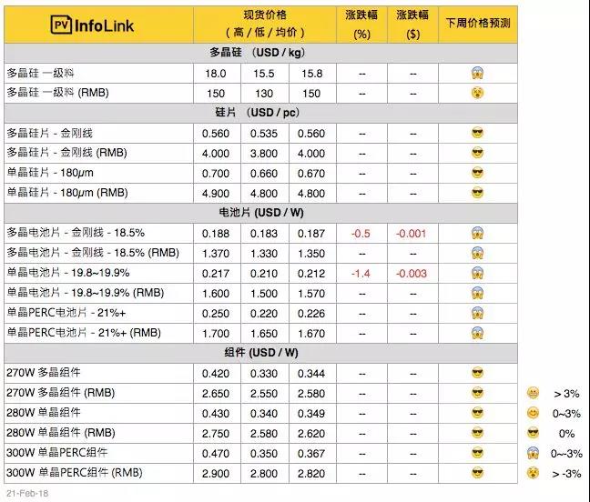 近期组件并未出现太多新的成交价,包括美国市场虽201税率已见明朗,现货价格仍因为成交量稀少而未出现明显变动。国内市场部分,常规多晶组件在大型专案订单维持先前每瓦略低于2.6元人民币的价格。由于农历年前后需求冷清,不少组件厂二月也将出现开工率下调的情形。