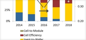 主要有两种因素促成了多晶硅g/ W消耗量的下跌:金刚线切割和电池效率的提高(更多的使用单晶,尤其是PERC技术)。到2018年年底,几乎所有的硅片生产(单晶和多晶)都会使用金刚线,几乎所有的单晶产品都会使用PERC技术,而多晶产品将会经历自身PERC技术升级的阶段。这些变化令其他阶段发生的渐进式改进(铸锭/拉锭、电池-组件损失和硅片厚度减少)相形见绌。