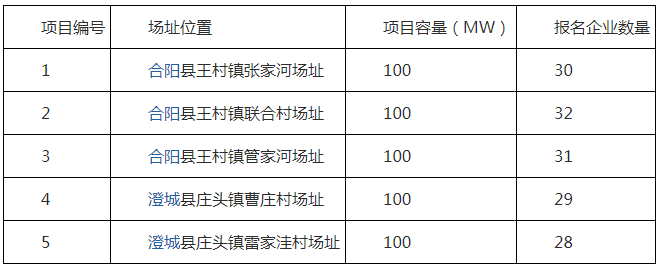 根据《渭南光伏发电应用领跑基地2017年竞争优选公告》,截止至2018年2月15日,共接收36家企业报名,各项目报名企业数量见下表。