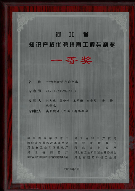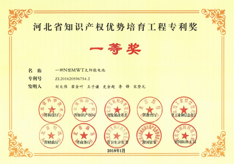 据了解,“河北省知识产权优势培育工程专利奖”是河北省对专利项的最高奖励。此次共有百余项专利参加奖项评选,由省科技厅、知识产权局等10部门共同评审,省内各领域专家审核,代表省内专利奖评定最高水平。最终共评选出38项获奖项目,其中一等奖三项,英利“一种N型MWT太阳能电池”专利获“河北省知识产权优势培育工程专利奖”一等奖。