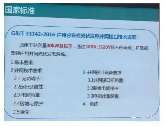 新国标《GB/T 33342-2016 户用分布式光伏发电并网接口技术规范》,进一步明确:总容量30kW及以下,通过380V/220V接入的新建、扩建或改建户用并网光伏发电系统,光伏发电系统接入容量超过本配电台区变压器额定容量 25% 时,公用电网配电变压器低压侧应配置低压总开关,并在配电变压器低压母线处装设反孤岛装置。