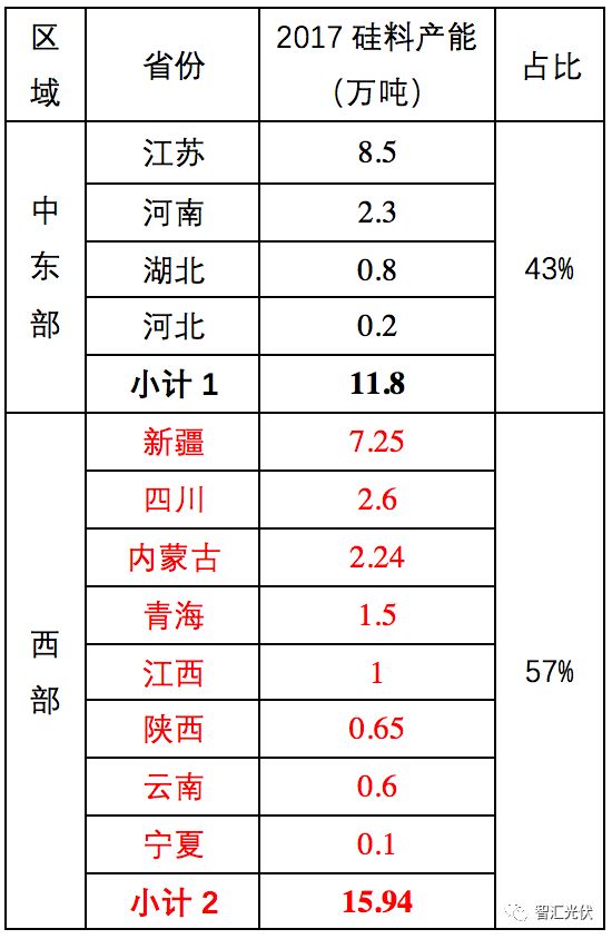 光伏上游制造端属于高载能、劳动密集型产业,西部省份低廉的能源价格、人力成本成为许多光伏制造企业建厂的首选。以硅料环节为例,截止2017年底的27.64万吨产能中,西部省份的硅料产能占全国总产能的57%(如表4所示)。同时,2018年各企业约有13.85万吨扩产计划,几乎全部位于内蒙古、新疆、云南、陕西4省。届时,西部的硅料产能将占全国的76%!