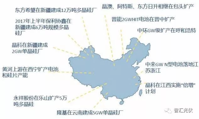 除了硅料环节,各企业硅片环节的扩产基本也都布局在西部地区。如单晶硅片龙头企业隆基在云南楚雄布局了10GW的单晶硅片产能,将在2018年底投产;晶澳、阿特斯、东方日升等企业在内蒙也有扩产。在此引用中国光伏行业协会王勃华秘书长之前的图片作为说明。