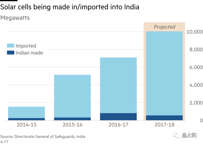 印度已成为最新的“光伏战”战场,这场“战争”围绕的是保护本土太阳能电池板制造商免受定价低廉的中国竞争对手伤害。印度监管机构正计划开征一项税率为70%的进口关税,而该国的太阳能发电开发商警告称,此举可能会使该国快速发展的太阳能发电产业陷入停滞。