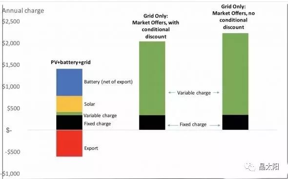 在澳大利亚,目前居民电价平均水平已经达到0.424澳元/千瓦时(这是考虑部分折扣后的电价,如果不考虑折扣平均电价达到0.464澳元/千瓦时)。那么,如果澳大利亚居民无法忍受如此高昂的电网供电价格,自家安装5千瓦的光伏系统(价格5500澳元,寿命20年),再加上特斯拉第二代电池包(Tesla Powerwall 2,容量13.5千瓦时,2018年售价11,075澳元),光伏余电上网电价收入0.16澳元/千瓦时,那么这一套系统每年的支出费用明显低于电网电价。