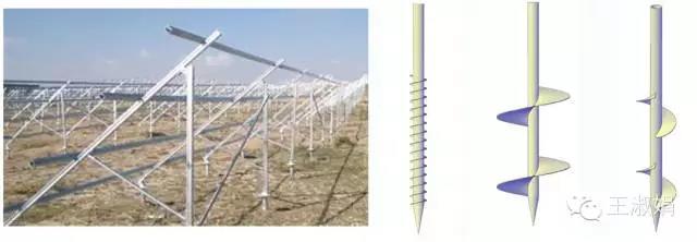 在光伏支架的前后立柱下面采用带螺旋叶片的热镀锌钢管桩,旋转叶片可大可小、可连续可间断,旋转叶片与钢管之间采用连续焊接。