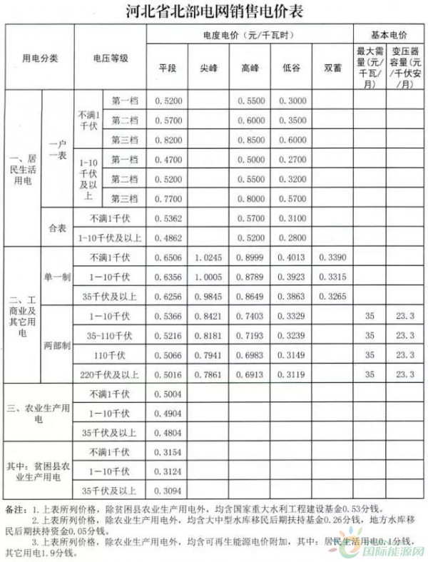 2017年6月,河北省物价局发布《关于合理调整电价结构有关事项的通知》,自7月1日起,南、北电网平均销售电价分别降低0.75分、0.87分,同时调整工商业及其它用电峰谷时段。具体如下图