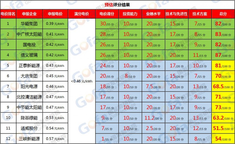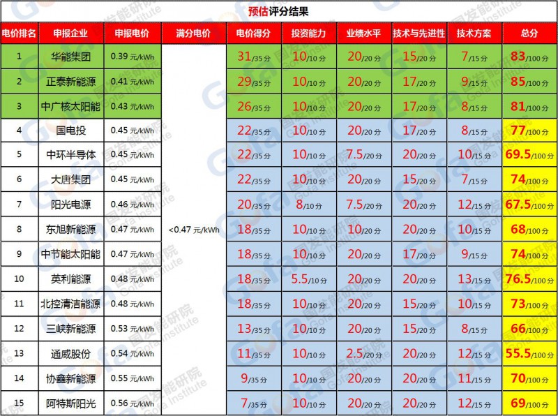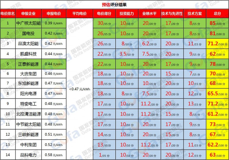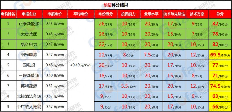 从项目2预估评分结果来看,中广核太阳能、国电投、正泰新能源等三家企业具有竞争此标段的可能。其中中广核太阳能在电价上的优势明显,但也有可能在技术方案评审中因为电价过低而失去分数优势。