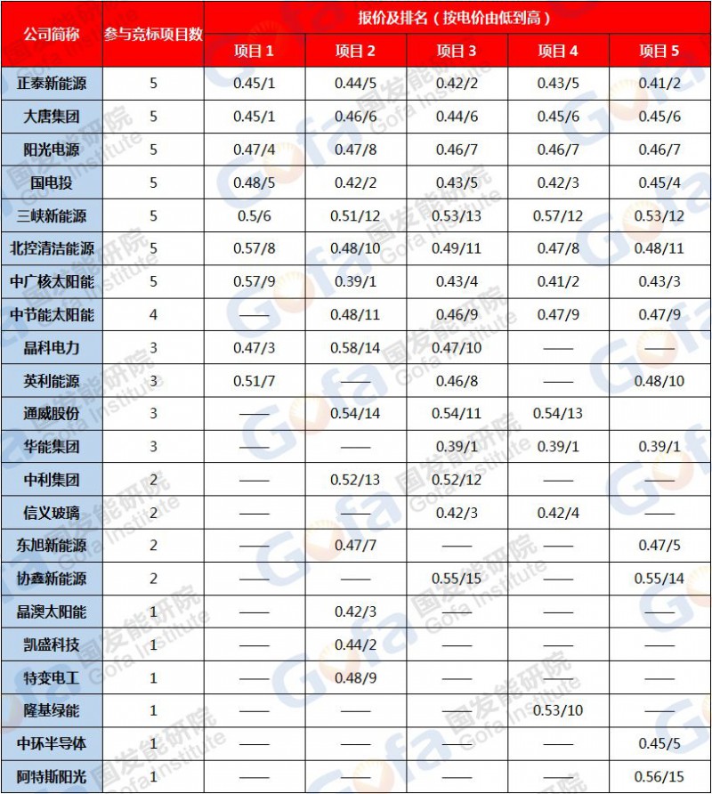 国发能研院、绿能智库梳理发现,此次共有22家企业分别竞争5个标段的项目开发权,其中有7家企业参与了所有标段的竞标,分别是正泰新能源、大唐集团、中广核太阳能、三峡新能源、国电投、北控清洁能源、阳光电源。其中正泰新能源五个标段的报价都比较低,排在最低电价的前五名以内,且在项目1是最低报价,项目3和项目5是次低报价。其次是中广核太阳能,拥有1个最低报价和1个次低电价。