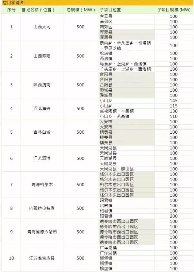 3月13日,内蒙古达拉特旗、河北海兴及陕西渭南等三地项目截标;3月14日,江苏泗洪、宝应等两地项目截标;3月15日,山西大同二期及寿阳等两地项目截标;3月17日,青海格尔木、德令哈等两地项目截标。逾期递交申报材料的竞标公司,将与领跑者项目彻底“拜拜”。