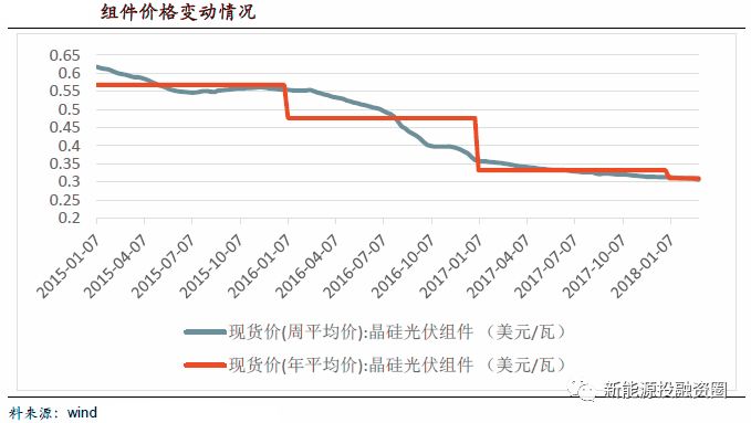 2018年单晶硅片龙头隆基股份三次调价,目前单晶硅片国内报价4.55元/片、国外报价0.63美元,总降价达到0.85元/片。同时2018年1-2月份多晶硅价格呈现出明显的“断崖式下跌”走势,2月初开始,多晶硅价格瞬间断崖式下跌,2月底价格为12.46万元/吨,降幅高达18.6%。2月均价12.96万元/吨,环比下滑15.3%。电池片和组件的环节较为平稳,我们认为经过一季度的淡季,价格大幅调整后,在二季度即将迎来抢装,各个环节价格趋于稳定。