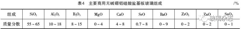 上述TFT-LCD基板玻璃的理化性能主要是由玻璃的化学组成来决定的,为满足液晶面板基板玻璃的各项要求,美国康宁、日本旭硝子等选择的玻璃体系为SiO2-Al2O3- B2O3-RO,其中RO 为碱土金属MgO、CaO、SrO、BaO的一种或多种组合。另外,还可在玻璃中加入少量的SnO2、ZnO、ZrO2调节玻璃的熔制性能、化学稳定性和机械性能,以及其它微量成分。主要商用无碱硼铝硅酸盐基板玻璃组成见表4。
