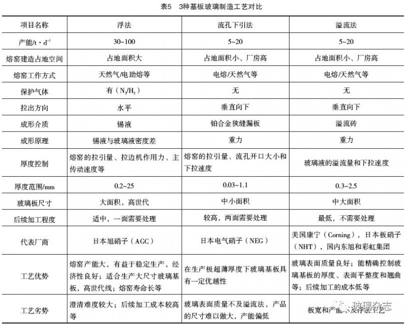 目前基板玻璃的制造工艺主要有浮法、流孔下引法和溢流法3种。流孔下引法的玻璃成形时直接接触金属滚轮,导致玻璃双面质量不高,需要后续抛光处理,加工难度较大,因此该法生产的玻璃不适合应用于TFT-LCD 液晶面板产业。美国康宁公司的溢流法成型工艺是目前生产TFT-LCD用基板玻璃的主要生产方法,该法成形时玻璃板表面仅与空气接触,形成自然表面,表观质量很高,但缺点是难以做高世代大尺寸基板玻璃,且产能小。日本旭硝子发展了浮法制造TFT-LCD基板玻璃的技术,浮法工艺易于扩大基板玻璃面积,降低单位成本,但在锡槽成型时接触液态锡的一面仍需要抛光处理去除锡层。3种基板玻璃制造工艺对比见表5。