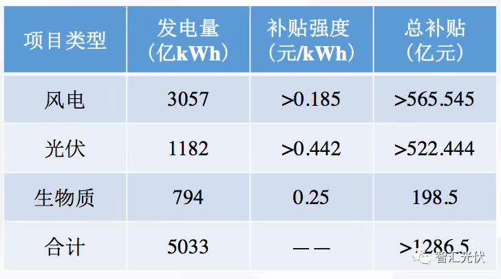 2017年,风电发电量为3057亿kWh ;光伏发电量为1182亿kWh,生物质发电量为794亿kWh 。对2017年当年的补贴预期如下表。