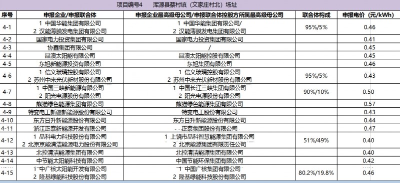 第三,从报名情况看,联合体对于大同二期项目的参与情绪很高。中国华能与汉能联合体参与了全部的5个;中广核与隆基绿能、三峡新能源与阳光电源等联合体也都报了5次名。晶科电力与京能联合体放弃了一个电站项目,其余4个电站项目没有遗漏,加入了争夺序列。
