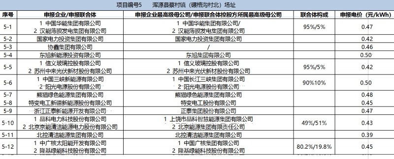 项目四,总计15家企业(或联合体)报名,没怎么出现过的晶澳太阳能、东旭新能源都在这一项目名单里。项目五,也有12家公司进入了竞标清单。