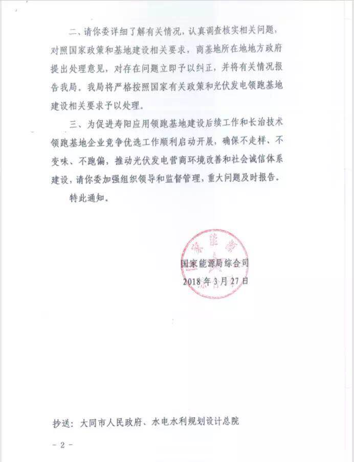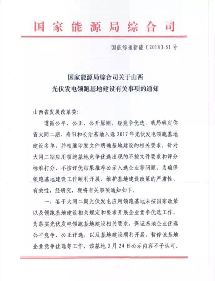 3月27日,国家能源局发文,否决了大同二期领跑者基地中标结果,要求山西发改委纠正相关问题。这也意味着大同二期的中标企业也将重新来过。