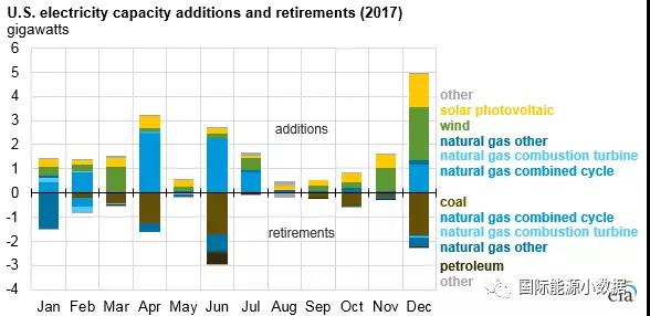 根据美国能源信息署发布的数据,2017年美国全年发电量为40,148万亿千瓦时,比2016年略有下降(-1.5%)。其中,天然气依然是美国第一大电源(占比31.7%),但与2016年相比,发电量(12,728亿千瓦时)比2016年下跌7.7%,创造天然气发电史上最大跌幅。2017年煤电总量为12,079亿千瓦时(占比30.1%),比2016年下降2.5%。天然气、煤电双双下跌也是10年来的首次。