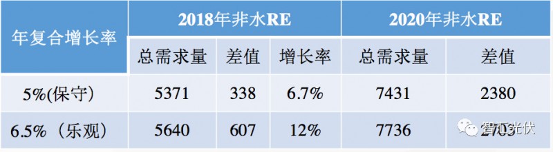 考虑到2017年的非水可再生能源电量为5033亿度,到2020年,风电的年按量比2017年将增加902亿kWh,全部非水可再生能源电量需要增加2380~2703亿亿kWh。则按照保守、乐观乐观两种情形估计,需要的光伏电量如下。
