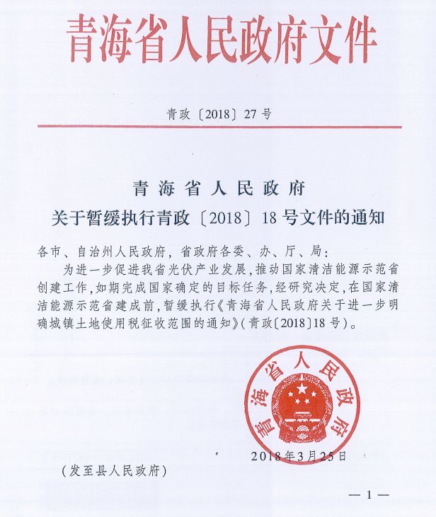 继青海省德令哈、格尔木两个领跑者基地被暂停优选工作之后,3月26日,青海省人民政府发文要求暂缓执行青政【2018】18号文件,即《青海省人民政府关于进一步明确城镇土地使用税征收范围的通知》。文件指出,为进一步促进我省光伏产业发展,如期完成国家确定的任务目标,在国家清洁能源示范省建成之前,暂缓执行该文件。