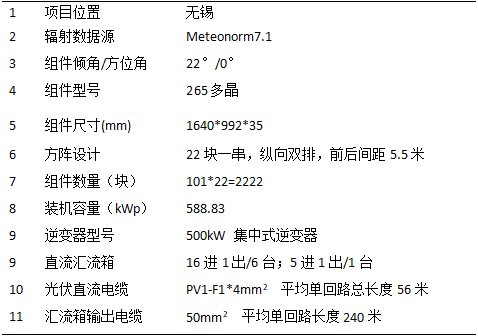 组件纵向双排安装,根据冬至日上午9时至下午15时无阴影遮挡的前后间距为5.5米,组件系统为容量588kW,使用一台集中式逆变器,共7个汇流箱。