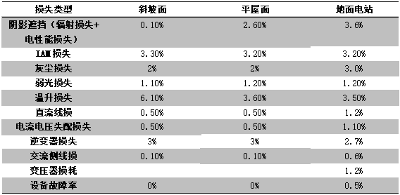 1)斜坡面系统:因为组件顺坡布置,和屋面距离10cm,对组件的散热会带来一定影响,根据模拟结果,产生温升损失约6.1%,组串逆变器的损耗(转换效率及MPPT损失)平均为3%。首年系统效率为83.3%。具体参考表7所列举的主要损耗项目。