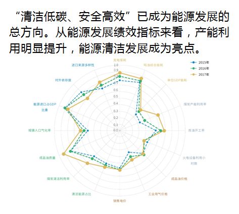 ▶2017年,“清洁低碳、安全高效”已成为能源发展的总方向。从能源发展绩效指标来看,产能利用明显提升,能源清洁发展成为亮点。