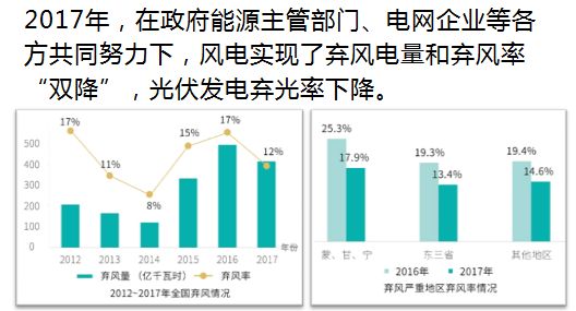 ▶从供应方面来看,2017年的热点问题主要有四个,一是在政府能源主管部门、电网企业等各方共同努力下,风电实现了弃风电量和弃风率“双降”,光伏发电弃光率下降。