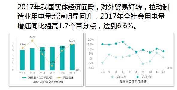▶三是因为2017年我国实体经济回暖,对外贸易好转,拉动制造业用电量增速明显回升,2017年全社会用电量增速同比提高1.7个百分点,达到6.6%。