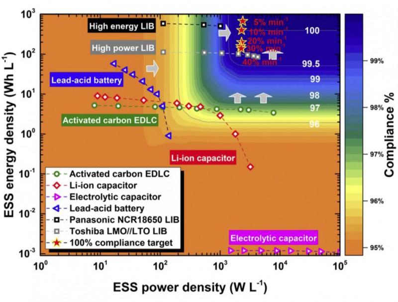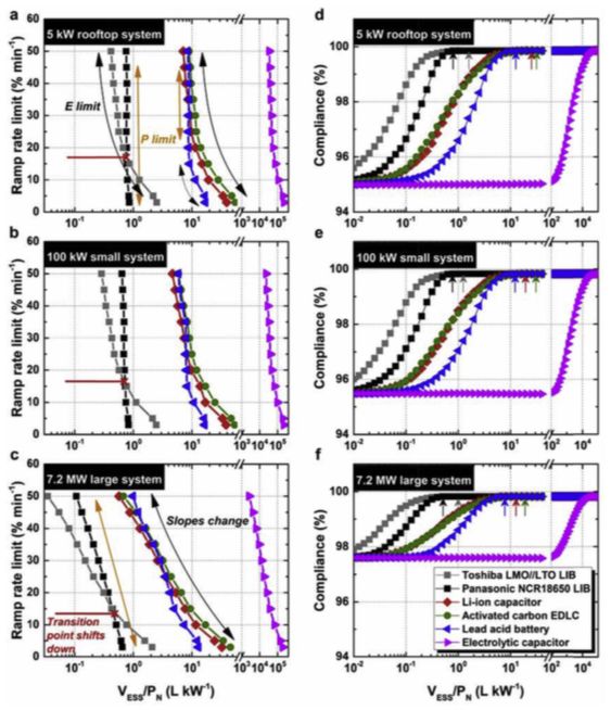 随着系统的增大,储能系统更多的从能量密度限制,转变成了功率密度限制。也就是说,高功率密度的储能系统更具有优势。在这方面,锂离子电池具有重大的技术优势。目前相较于铅酸电池,锂离子电池成本高处1倍到3倍不等,但是未来具有更大的降本空间。至于电容系列,虽然功率密度足够甚至超过要求,但能量密度距离一整天的发电出力缓冲,相去甚远。研究发现,高能量密度的锂离子电池(低于600瓦时每升)最符合光伏出力缓冲的要求,基本可以100%达到10%爬坡速率控制的要求。