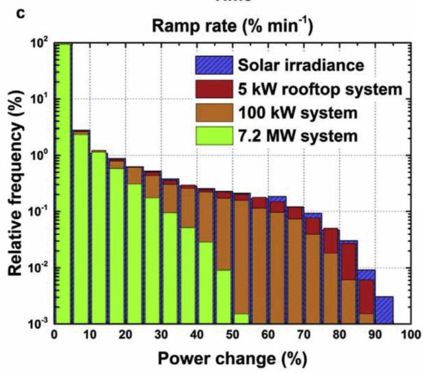 不同的光伏系统对于储能系统的要求大不相同。文章考察了单个组件、5千瓦屋顶系统、100千瓦小型光伏电站、以及7.2兆瓦大型电站四个场景。一般而言,大型系统占地面积大,具有一定“地理聚集”(geographical aggregation)的发电出力平滑能力。在江屿的算法中,引入了一个叫做截断频率(cut-off frequency)的东东,通过经验公式考虑到了这个自动平滑的现象。下图看到,越大的系统,其自带发电出力平滑的能力越强,无论是光功率变化的剧烈程度还是频度都有下降!