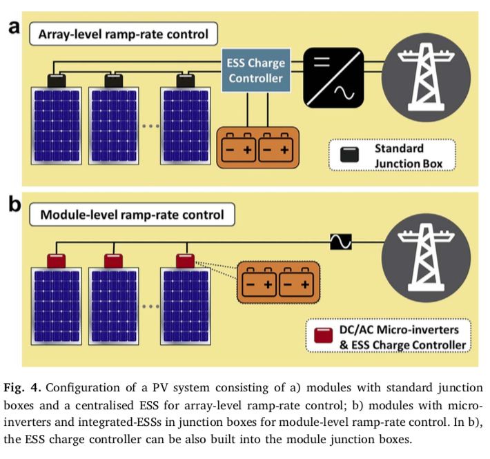 文章还提出了一个非常具有新颖性和吸引力的技术方案——在微型逆变器和组件优化器上集成储能系统。这样既满足了发电出力平滑的要求,又增加了系统整体的发电能力(储能单元使得光伏组件不需要过度偏离组件发电的最佳功率点)。作为一个初步的设想,作者把储能单元体积控制在100立方厘米之内,也即是收入接线盒中。这需要最少400瓦时每升的能量密度,2300瓦每升的功率密度,这已经超出了现今量产锂离子电池可以达到的指标。如果用现今量产的锂离子电池性能指标加以衡量,10%的爬坡速率控制可以达到99.5%的达标率(即每1000次出现爬坡速率超过10%的情况,995次可以得到解决)。