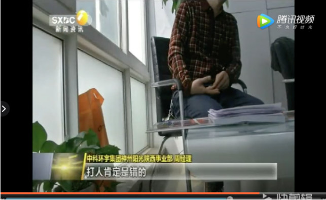 在视频截图中显示,中科环宇承认打人并意识到错误,打人者为安装售后的项目经理。