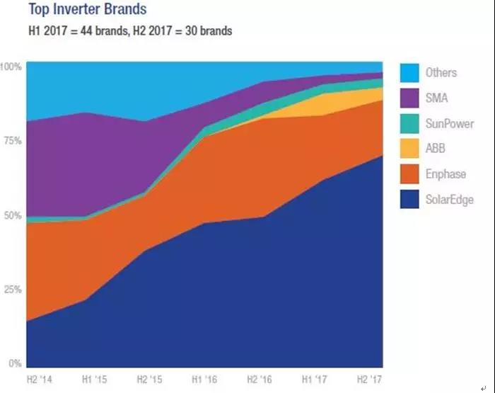 这张调查图表显示,SolarEdge公司已成为住宅太阳能发电设备的主导品牌。从尺寸和复杂性来考虑,该公司安装量的增加可能直接归因于来自SolarEdge公司和Enphase公司的模块级电子器件。