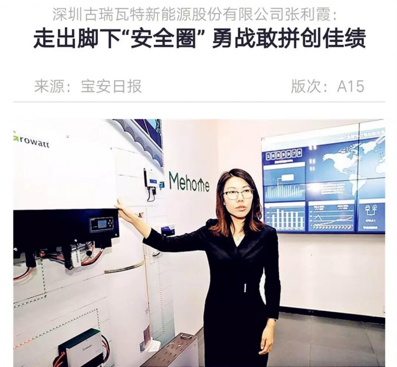 近日,宝安日报发布《深圳古瑞瓦特新能源股份有限公司张利霞:走出脚下“安全圈” 勇战敢拼创佳绩》一文,独家专访了古瑞瓦特市场总监张利霞:“今年我们要继续保持奋斗精神,领跑市场,争取超过目前30%的市场占有率。希望我和家人、同事们都身体健康,家庭和谐、美满。”