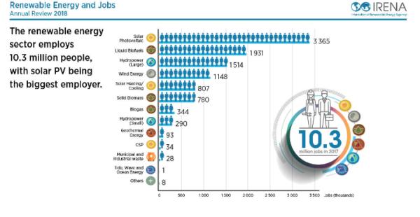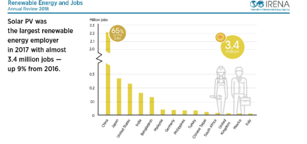 IRENA 在发布的报告中称,2017年,可再生能源行业在全球创造了超过50万个新的就业机会。中国、巴西、美国、印度、德国和日本仍然是全球最大的可再生能源雇主,占比超过全球工作岗位的70%。
