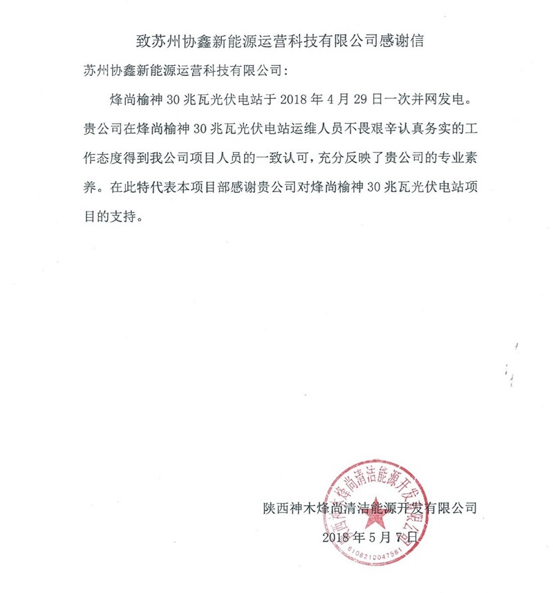 榆林烽尚代运维工作时间紧、任务重,运营团队积极克服挑战,顺利完成电站的并网工作,得到了业主方、施工方的一致认可,业主特向我公司发送感谢信以表示对我司专业能力的肯定。