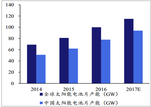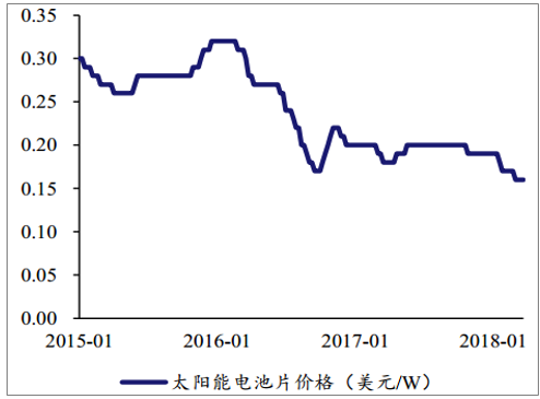 光伏电池片:从整个行业来看,产能呈现上升趋势,预计 2017 年产能将达到98GW,价格则逐渐下降,2015 年至 2018 年间,太阳能电池片价格下降了 0.15美元/W,下降幅度达 50%。价格下降的动力主要来自技术进步和上游原材料价格的下降,因此从总体上来看毛利率将保持平稳。